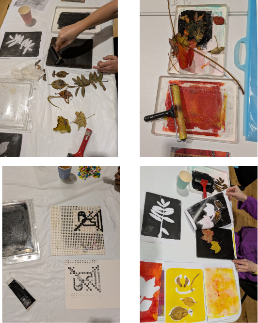 Images: A selection of images from our “Quiet Group” workshop which involved mono-printing processes, including ‘gelli plate’ printing with autumn leaves and Lego printing.