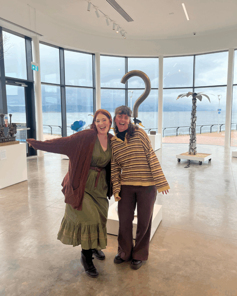Image: Fiona and Nicole, both local artists, who are also on the team at The Wyllieum, in front of Wyllie’s signature question mark.