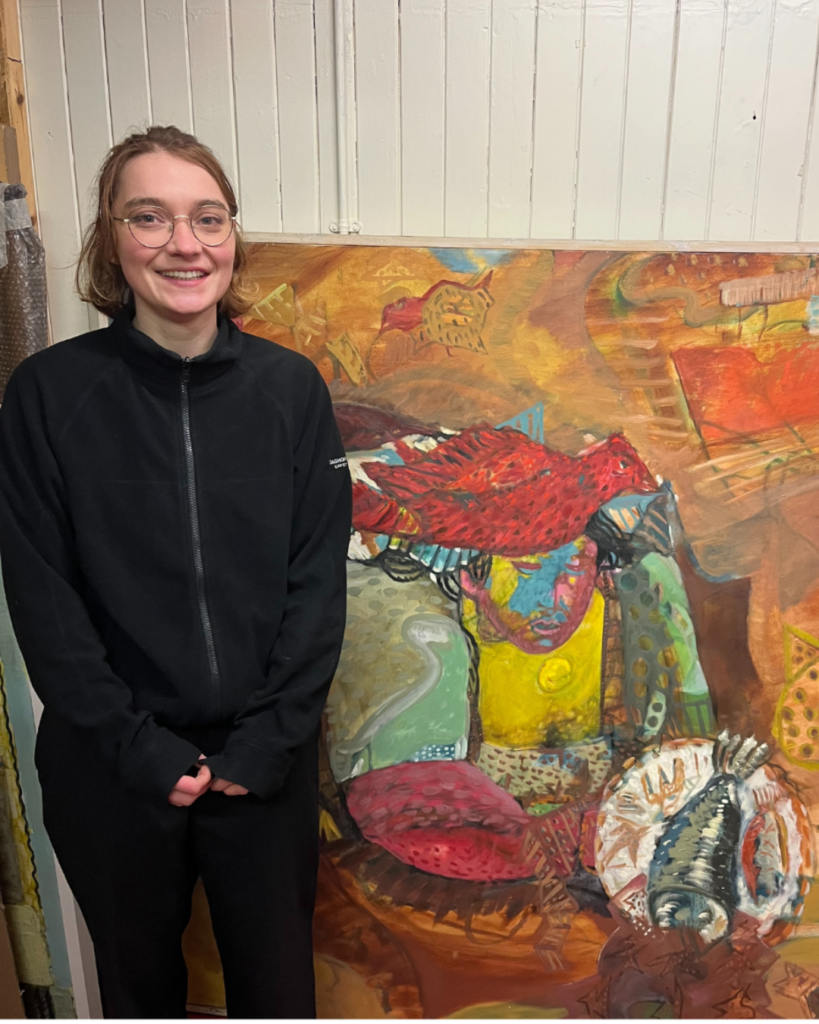 Image: Mina standing in front of The Herring Quine by Graham Fyfe from the Art in Healthcare Collection