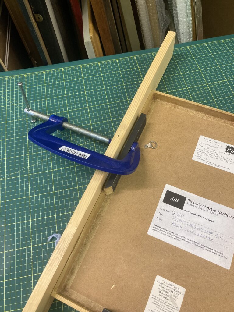 Our two works had a little bit of damage on the frames, so we set out to repair them. We sanded the sections back, glued and clamped them together, and finished with a little bit of wax to make it all blend in. Both frames are now good as new and ready to be exhibited!