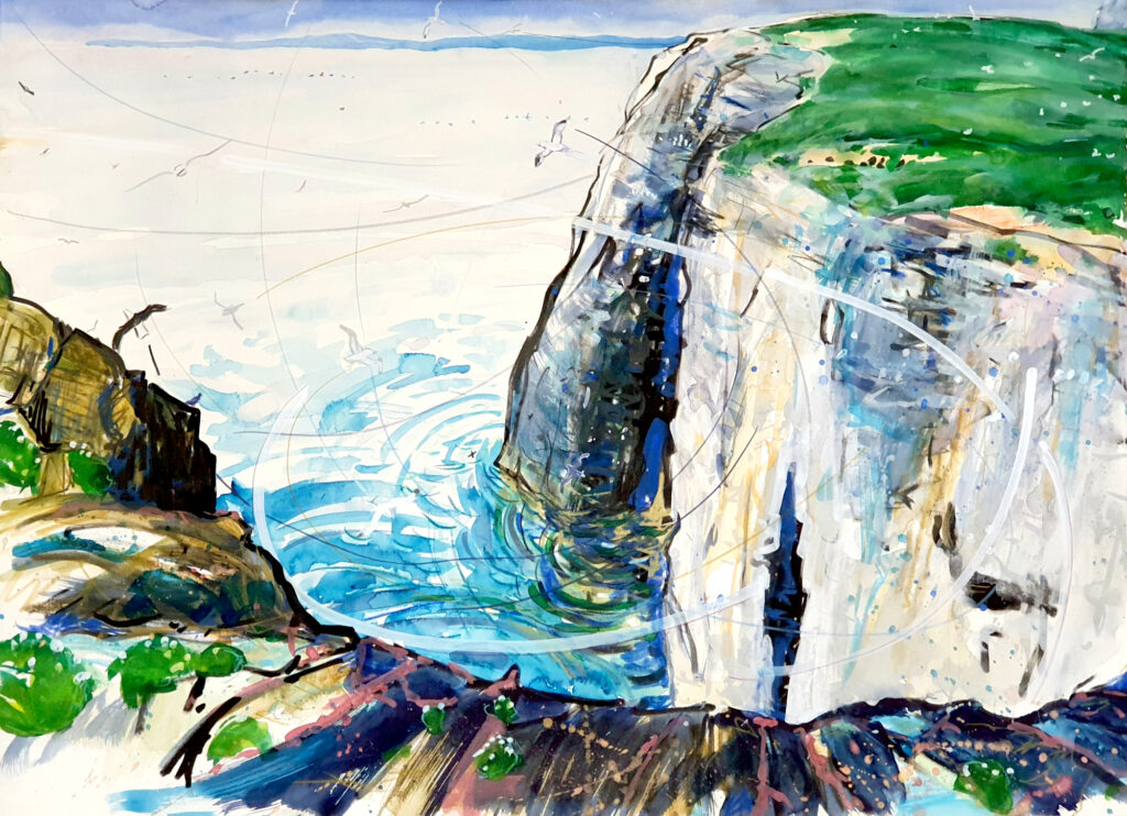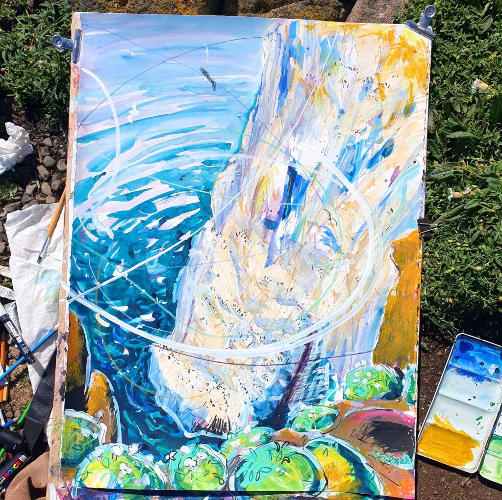 And my own practice – I’m a graduate of Edinburgh College of Art. I’m a painter, based among the birdlife and sealife of Fife on Scotland’s east coast. I paint land and nature, drama and colour, story. I love creating my work out in the landscape and I love painting back in my beautiful railway station studio in Burntisland. I love painting on a large scale and I love painting in miniature. The Isle of May is probably my most important of all inspirations, and my rail explorations in my role as ScotRail Community Rail Champion are a close second.
